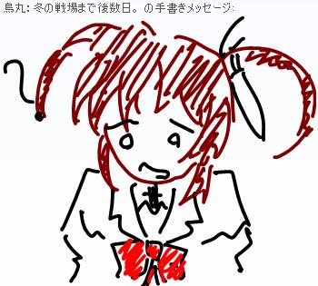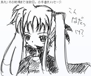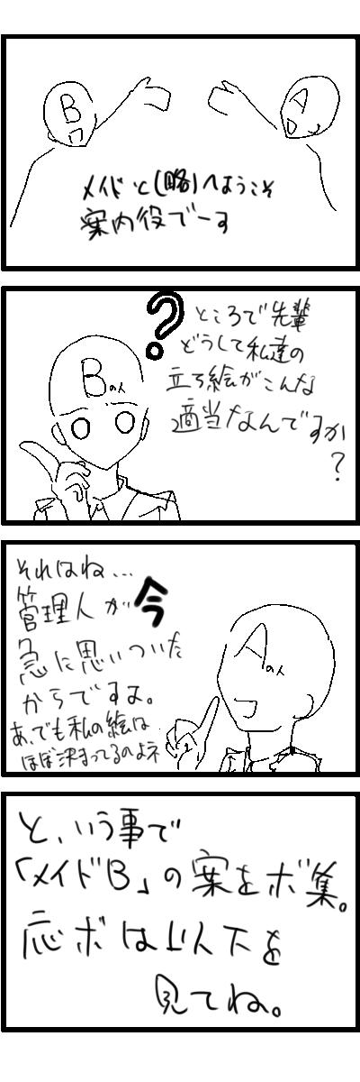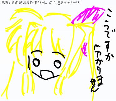 むしろ決定方法も決めてない突発さ! とりあえずAが出来るまで受け付けてますよー。 ここまでのまとめ 投票方法はコメント ■■■■■■■■■■■■■■■■ 名前:「」 髪型: 髪色: 目?: 性格: アピールタイム! ■■■■■■■■■■■■■■■■ 以上のテンプレで。 ここまで出てきた案 http://torisuma.blog.shinobi.jp/Entry/116/#comment ここを参照。 現在の進行度 A子■■■□□【60%】→現在の作業状態 B子□□□□□【00%】 使ってるのはsai、個人的お気に入りソフトなんですよっ もう少しまってね!(汗 PR 描くものが決まらないときは 同じキャラ描けばいいじゃなーい!! とか、考え始めたので 看板娘でも考えよう企画。 わざわざコミスタでネーム描いてたら あんまり意味ないなぁとか思ったのでやめました(マテ -----------------ここから企画説明---------------- 1)Aは私が勝手に趣味全開で描きます(ぇ 2)Aが元々私の家にいたメイドです。意義は受け付けません 3)新人としてBが参加する事になりました。 4)と、いうことでBのビジュアルを募集します。 募集項目。 1:名前 2:髪型と色 3:顔(と、いうか目 4:性格 5:アピールポイント(ぇ と、いうことでテンプレを置いておきましょう 空欄を埋めてコメントでどうぞ。 注1)私の画力で描ける範囲内で! 注2)エロとかありえないよ! 以下テンプレ、コピーして使ってね ■■■■■■■■■■■■■■■■ 名前:「」 髪型: 髪色: 目?: 性格: アピールタイム! ■■■■■■■■■■■■■■■■ アピールタイムは適当な会話とかでもokよっ ドジっ娘すぎると雇ってもらえないゾ☆(カエレ 最後にこないだメッセ手描きで描いてた絵を投下。 なのは とか フェイト とか フェイト とか |